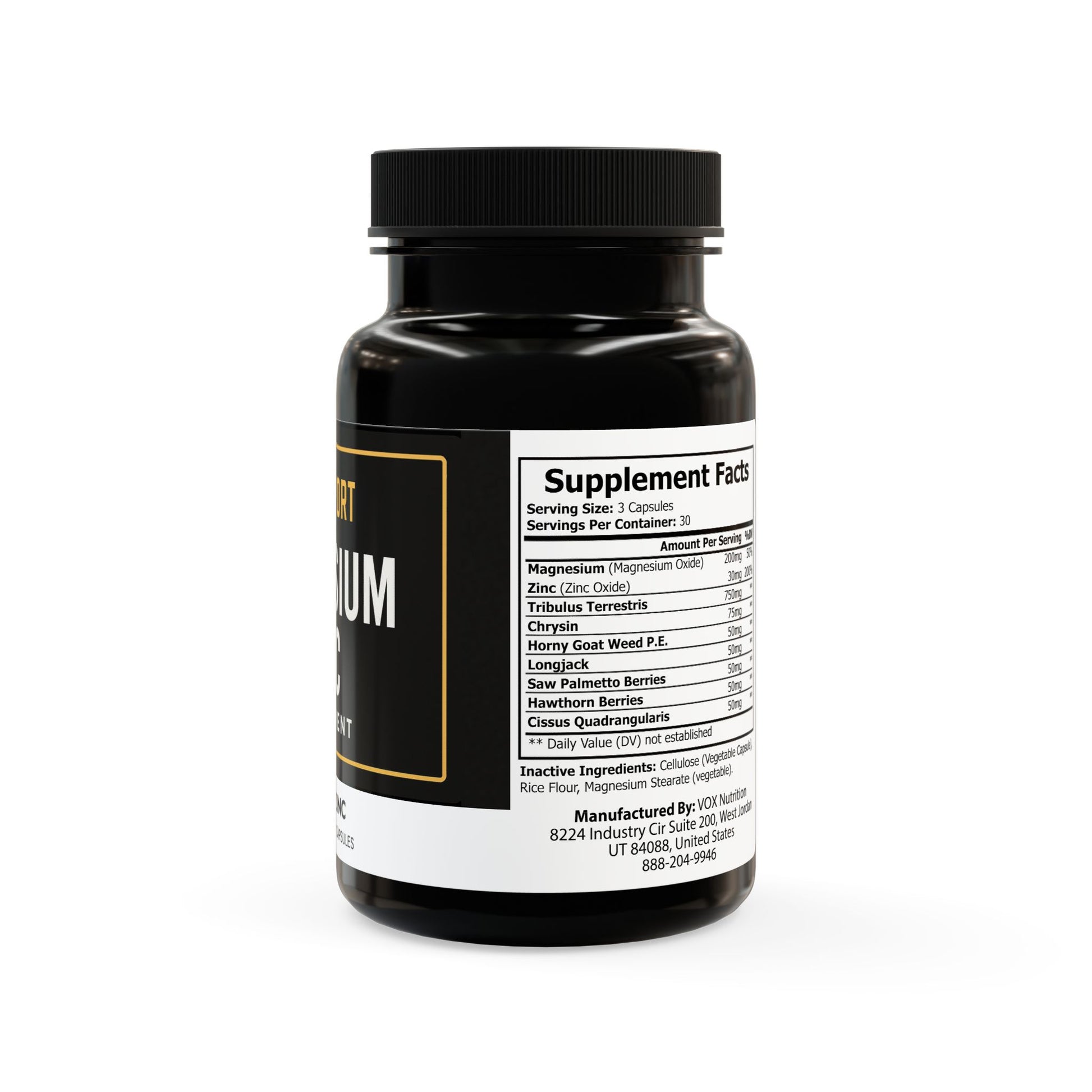 Key ingredients include Magnesium (Magnesium Oxide), Zinc (Zinc Oxide), Tribulus Terrestris, Chrysin, Horny Goat Weed, Longjack, Saw Palmetto Berries, Hawthorn Berries, and Cissus Quadrangularis.